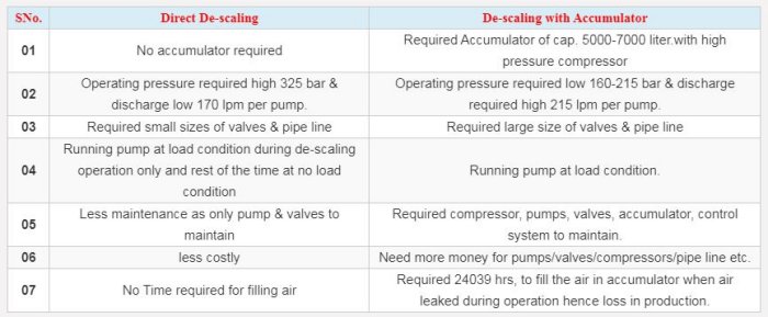 The de-scaling is being done through accumulator, which accumulates the water at high pressure by High Pressure reciprocating pumps and use the pressurized water as and when required through emergency valve, operational valve and de-scaling Header.