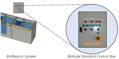 - All electrical component in the BioReactor system; e.g. blowers, pumps, UV-units , are integrated and connected to the BioKube Standard Control Box, from where the power is distributed and controlled.