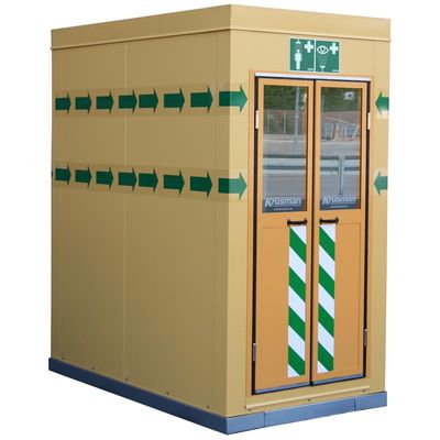 Krusman insulated booth with safety station and heater. Walls, ceilings and floors are made of 50 mm insulated panels with finishes of painted sheet steel. Self-closing doors. Inner floor with plastic carpet and floor drain without water trap. Mounted lighting and radiator for wet areas. Available for Ex-classified environments.