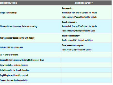Dedicated desiccant air-supply units provide lowhumidity discharge conditions necessary to maintain a dry environment. It`s a simple solution to an old problem. The solid desiccant rotor absorbs moisture from process air. The moisture is taken out of the rotor by a second and separate reactivating airstream. This process enables the rotor to continually take moisture out of the airstream without interruption. NSi Series units provide an excellent stand-alone solution when sensible heat gain is not a concern. To solve existing moisture problems NSi Series units can be added to existing conventional HVAC systems. The fully integrated dehumidifi er is complete with process and reactivation fi lters, fans and the complete control system for safe operation. Choose between direct gas fi red, steam, or electric actively heated reactivation.