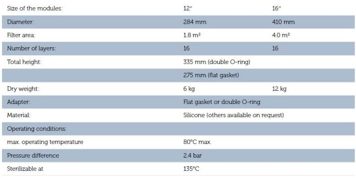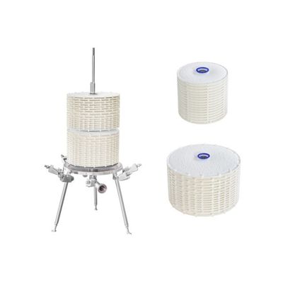 The individual cells are set one above the other with plastic spacer rings until a certain height is reached. The filtrate passes through this inner core. Then adapters (O-ring or flat gasket) are fastened to the inner core in order to secure the cells and establish a connection with the filtrate line. The complete construction forms a module with 12" or 16" diameter and 16 filter cells.