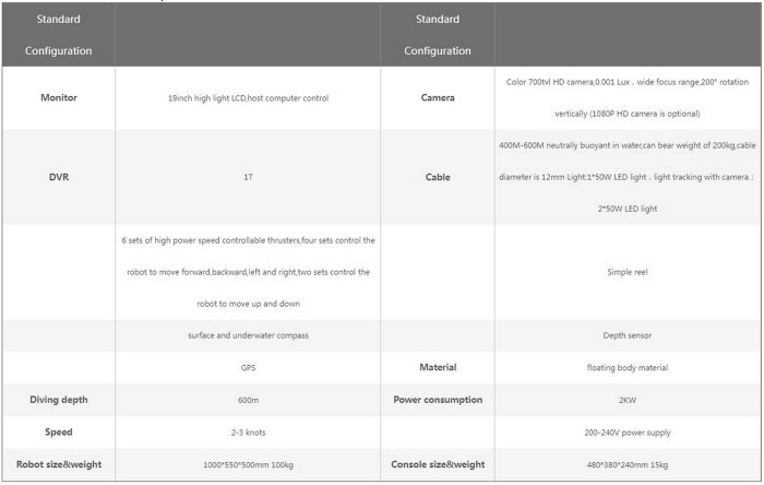 Deep Sea ROV GW-V1000-6T,diving depth can reach 600M.The newest floating body material makes it corrosion resistant,which also has low density,high strength and rigidity.3 knots of high water current can be resistant.High definition colorful camera and high power LED light can deliver the video to the console in time through underwater optical fiber cable which guarantee the clear images,can also equip the underwater animal 1080P HD video.The depth sensor and positioning system can upload real-time data to accomplish the navigation and positioning of robot for operator to analyze and study.Imaging sonar can also be equipped to give a good image on conditions of lower underwater visibility.Most popular related searches