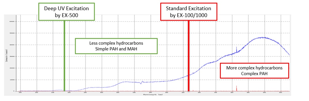 Deep UV Fluorescence signal of crude oil to the right of the green line capturing more of the aromatic hydrocarbons than just seen from the right of the red line with Laser Induced Fluroescence (LIF)