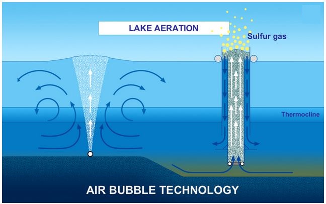 With the help of air-lift pumps, the deeper water is transported to the surface of the body of water without coming into contact with the thermocline or the epilimnion. After the water has absorbed the oxygen, it is brought back to the deeper area of the lake through downpipes running under the thermocline.