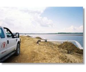 Deep well dewatering system for the Batchtown Wildlife Refuge Rehabilitation project near St. Louis, Missouri. The wells were installed on a oval earthen berm directly in the Mississippi River. Individual wells were pumping roughly 1750 gpm each.