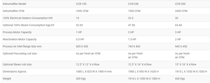 The basic Dehumidifier model starts from 360 CFM. This basic model is used for achieving the desired conditions. Depending on the requirement the larger models would be recommended for achieving the desired conditions.