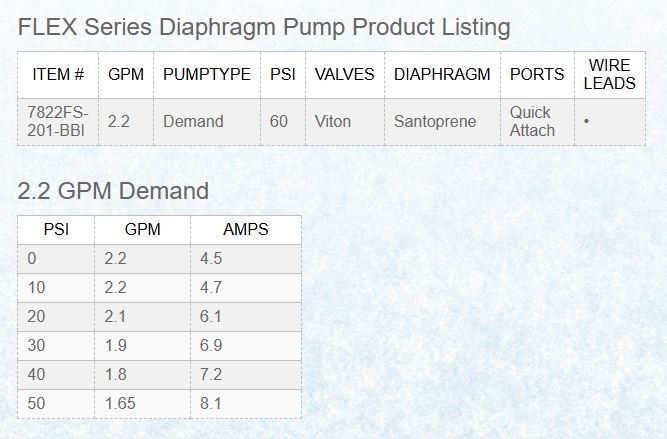 Pump Type: Demand. Flow: 2.2 GPM. Pressure: 60 PSI. Valves: Viton. Diaphragm: Santoprene. Ports: ¾” Quick Attach. Power: 12V – Wire Leads with 2-pin molded connector, 115V AC corded plug. Weight: 6 lbs.. Packaging: Bulk Box, Retail Box. Shipping: 6 per carton, single.