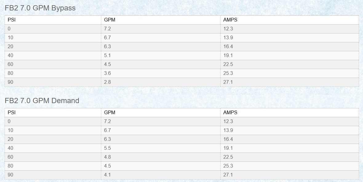 Pump Type: Bypass, Demand. Flow: Up to 7 GPM. Pressure: Up to 100 PSI. Valves: Viton. Diaphragm: Santoprene. Ports: ½” FNPT, ¾” Quick Attach. Power: 12V – Wire Leads with 2-pin molded connector. Weight: 8 lbs. Packaging: Bulk Box, Retail Box. Shipping: 6 per carton, single.