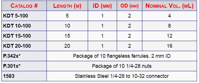 Aura Industries, Inc. has Knitted Delay Tubes (KDTs) to aid in the mass spec. or UV directed fractionation of HPLC fractions, in flow injection analysis etc. The knitting minimizes peak broadening while keeping the tubing in a compact size. Each KDT comes with two flangeless ferrules and nuts for connecting to 1/4-28 fittings. An optional connector with female 1/4-28 and female 10-32 threads with a 1 mm thru-hole is available (Cat# 1583). This connector allows connection of the 1/4-28 fittings to the standard 1/16 inch HPLC tubing. Additional KDT sizes are available upon request.