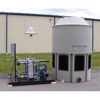 For closed-circuit cooling, Delta recommends a cooling tower plus a plate heat exchanger system. The skid-mounted plate heat exchanger provides a closed-circuit on the hot side of the heat exchanger. The non-corroding Delta cooling tower feeds the cold side of the plate heat exchanger. The advantages of this system over a closed-circuit cooling tower (usually galvanized sheet steel and galvanized steel coil inside a cooling tower box) are: