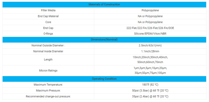 - PP core provides excellent strength of cartridge filter