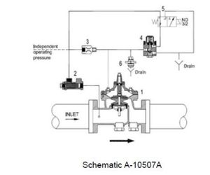 Singer Model 106 EDV-A-10507A Electric Solenoid control valve is based on the Singer Model 106 PG-UL Deluge main valve. The solenoid pilot provides on-off position operation. The solenoid either admits inlet pressure into the main valve operating chamber from the inlet of the main valve via a high capacity relay valve or releases pressure from the relay valve and therefore the main valve operating chamber. This either opens or closes the main valve. The pilot system is usually piped to discharge to drain (atmosphere).