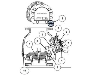 The pneumatic diaphragm (6) retains the water pressure in the chamber by closing the water exit port/orifice (7). To trip the valve the pilot line air pressure is released by one of 3 methods: