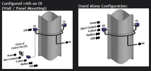 The light source in the transmitter is a high intensity, high reliability green LED which provides long life and stable intensity. The transmitted light beam is pulsed to give complete immunity to ambient light levels. The intensity of the transmitted light is monitored at source so that any variations in the emitted light level are compensated for at the Receiver. The Receiver has on board temperature measurement to provide stability over temperature.