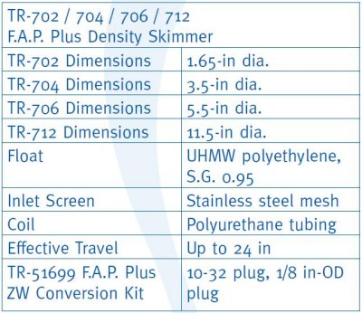 These skimmers have a specific gravity of 0.95 and float in the water with the top inlet just above the product/water interface. The 2 in and 4 in sizes are for use in well casings with these nominal inside diameters. The 6 in and 12 in models are self-supporting and may be used in large diameter wells, open excavations and open water applications.