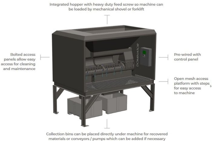 We supply everything you need; The Dominator, Intake Hopper, Screw Conveyors, Pumps, Controls Panel, Platform and anything needed