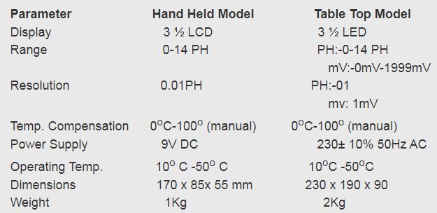 Digital ph/mV meter is an unique instrument for measuring PH value of any solution .The use of C- MOS LSI technology makes the instrument versatile and reliable . Digital display with automatic polarity indication and decimal positioning eliminates manual errors and allows measurement with accuracy and excellent resolution . These PH Meters are available in two model: HAND HELD (for PH measurement only), TABLE TOP (for PH/mV measurement).
