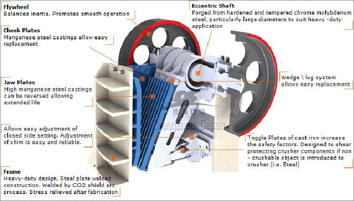 The electric motor drives the eccentric shaft by belt pulley to make moving jaw toothed plate move upward and downward, so as to push the moving jaw toothed plate to the fixed jaw toothed plate, to crush the material or splitting the material by doing reciprocating motion of approaching and leaving.