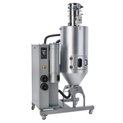 The ADC Series Dryer combines the efficiency of a wheel dryer with an integrated pneumatic conveying system, a receiver for the drying hopper, a receiver for the injection molding machine and all related accessories. The ADC Series is particularly suitable as an independent flexible dryer to be positioned next to the processing machine.