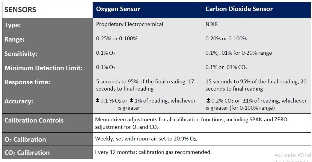 Our long-life, proprietary design yields accurate low-level measurements down to 0.1% oxygen and measures full range up to 100% level. The sensor response is 5 seconds to 95%. The output is compensated for ambient temperature variations. The sensor is not heated, has no moving parts, and requires no routine maintenance. CO2 does not interfere with the oxygen reading – even 99% CO2 will have no effect on the oxygen reading.