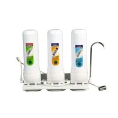 Three-stage desktop quick-connect water purifier with water separator, PP melt + bulk activated carbon + carbon rod. Inlet pressure: 8-125psi/6-8.6KG/cm2.