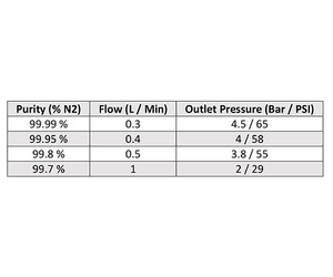 Whilst the Nevis Desktop is designed to provide high purity Nitrogen at its optimal flow rate it can be set up to provide higher flow rates at greatly reduced purity levels as indicated here: