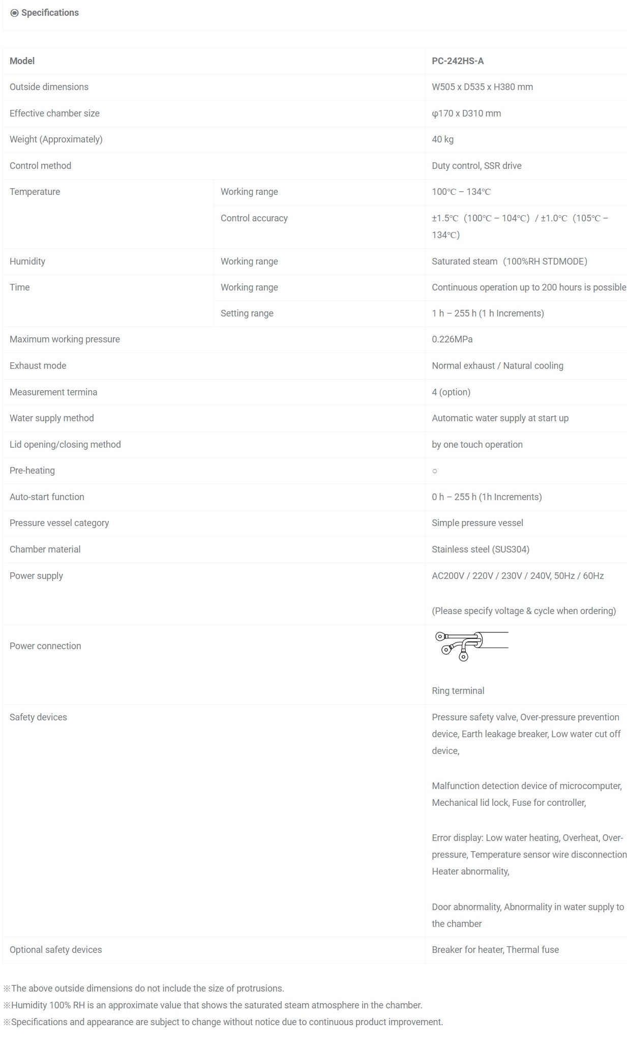 Model: PC-242HS-A. Outside dimensions: W505 x D535 x H380 mm. Effective chamber size: φ170 x D310 mm. Weight (Approximately): 40 kg. Control method: Duty control, SSR drive.