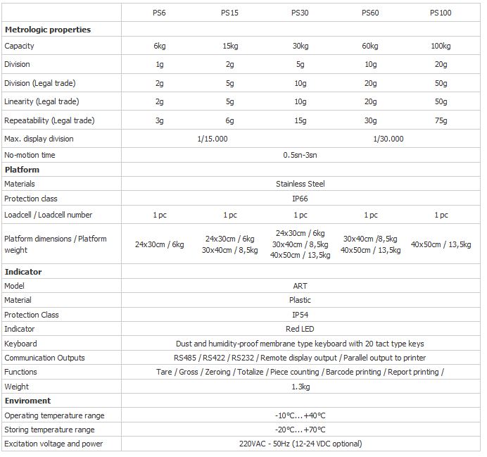Fully-automatic, single-load cell Esit PS desktop scales are robust and reliable devices designed to withstand heavy industrial conditions. Standardly bundled with multi-functional electronic indicator ART, and produced in various capacities (6 kg, 15 kg, 30 kg and 60 kg) and sizes (24x30 cm, 30x40 cm, 40x50 cm) with a stainless steel platform and load-bearing parts, Esit PS scales aim to meet all types of user requirements. PS desktop scales may be integrated with other Esit indicators to be used in various other applications and under many different conditions. There are stainless steel and Exproof types for use in case of humidity and in the presence of flammable materials. They optionally feature filling control and industrial control outputs.