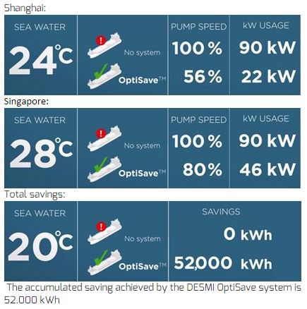 With DESMI OptiSave it is simple - save 80,000 USD by having an intelligent control of your cooling water system. The cooling water system on-board vessels is designed for operation in 32°C seawater and 100% engine load and the auxiliary equipment runs as if this condition is permanent. However, the seawater temperatures of the oceans are not 32°C all over the world. Actually, there are only few hotspots where these conditions are present. This means that the cooling system in 95% of operation time are absorbing too much energy.