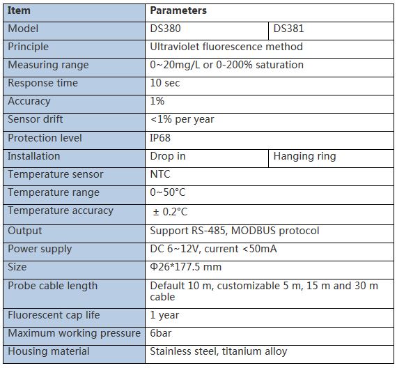 The DS380 series of fluorescent dissolved oxygen sensorsuse a new generation of fluorescence lifetime technology andhighperformance fluorescent materials. No oxygen consumption,o flow rate limitation, no electrolyte, no maintenance and calibration,no interference from hydrogen sulfide, excellent stability. Built-intemperature sensor, automatic temperature compensation. RS485 output, can be networked without a controller.