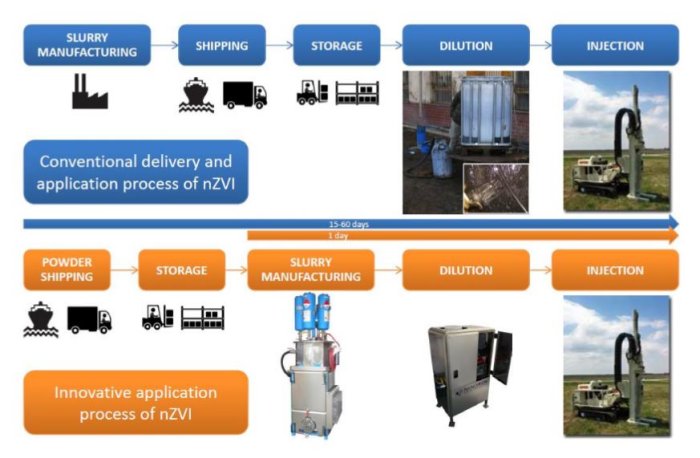 The equipment provides manufacturing capacity of 50-150 kilograms of slurry in one batch and is dedicated particularly for on-site production of nZVI slurry in large volumes. Earliest application of fresh manufactured product ensures highest possible reactivity and mobility of nanoparticles. It is also possible to disperse other nano-powder materials in various liquids.