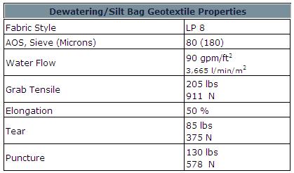 The Dewatering Bag is a geotextile filter bag for removing silt from water. It is designed to filter water as it is pumped from a storage site, removing hazardous materials such as silt before they can damage the environment. The silt bag is an economical choice for preventing costly clean up of a storm water system. The potential liability from adding silt to an aquatic ecosystem makes the silt bag a valuable environmental protection tool.