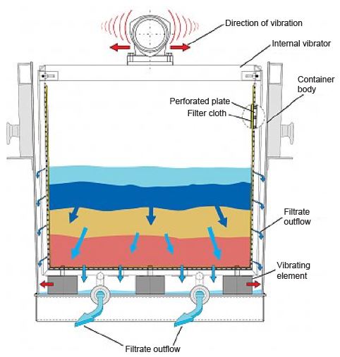 Due to the redesign of the internal filter basket as oscillating vibrating screen sludge dewatering and drying is significantly increased. Wet sludge stored in the filter basket is brought to swinging by a high frequency vibrating unit. Even difficult sludge is treated with optimum results. The high-frequency vibrator is wired ready for connection and provided with on / off switch and socket. The redesign of the inner filter basket as vibrating screen significantly increases sludge dewatering and drying. The wet sludge stored in the inner basket is put into a combined vibratory vibration movement and thereby even better dewatered and solidified.
