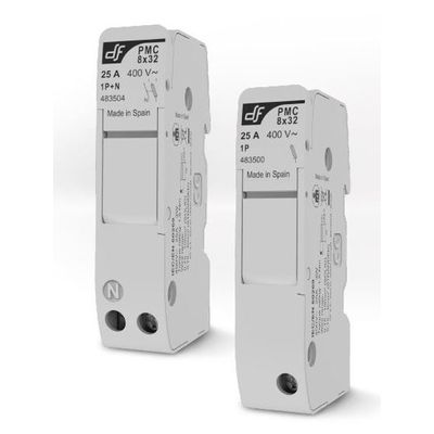 Compact fuse holders for cylindrical fuse links size 8×32 and 10×38 according IEC/EN 60269 standard. Compact design with reduced height. Ventilation zones optimized for a better heat dissipation. For mounting on DIN/EN rail. Single phase models or single phase + neutral in only one module. Multi-pole units can be made with connection accessories. PMC fuse holders are made with self-extinguishable materials and have silver plated copper contacts. All the materials are according to the European Directive 2002/95/EC RoHS (Restriction of the use of certain hazardous substances in electrical material).