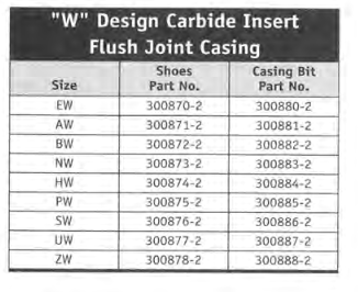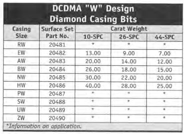 Acker surface set diamond casing shoes and bits ate available for the approved OCOMA flush joint "W" design casing. "W" casing bits and shores ate only available with box thread connections, Casing bits and shoes have a standard pin thread connection. Box threads are available on request.