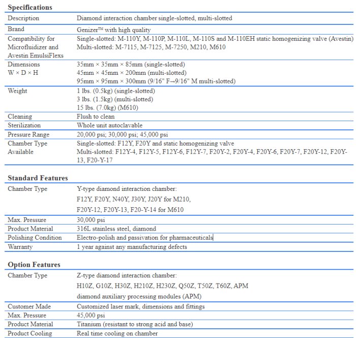 Diamond Interaction Chamber (DIXC) is used to produce uniform nanoparticles in a high-pressure homogenizer. The fixed geometry within the DIXC is intended to create a uniform processing profile so that all materials will be processed with equal disruptive forces. Single-slotted interaction chambers have a single microchannel and are ideal choices for small batch research, while the multi-slotted interaction chamber comprises multiple microchannels in parallel, which can be used at industrial scales, by increasing the flow rate through the DIXC but with equal processing forces.