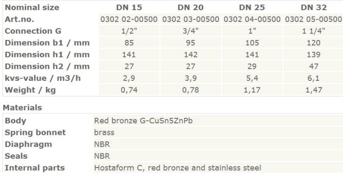 Body made of red bronze, spring bonnet in brass (up to size 32) or grey cast iron with protective coating (from size 40), diaphragm and seals of NBR, inner parts of Hostaform-C, red bronze and stainless steel.