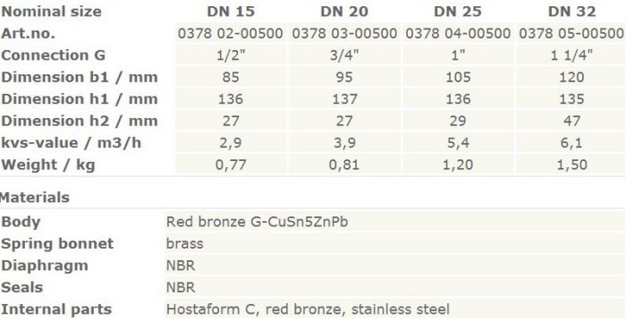 Body made of red bronze, spring bonnet in brass (up to size 32) or grey cast iron with protective coating (from size 40), diaphragm and seals of NBR, inner parts of Hostaform-C, red bronze, and stainless steel.