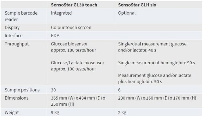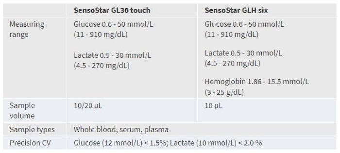 The SensoStar analyzers measure glucose (hematocrit corrected) and lactate with maintenance free biosensors from hemolyzed blood samples. SensoStar GLH six measures in addition hemoglobin photometrically. The SensoStar GL30 touch is a high-throughput system equipped with a 30 position sample rotor. The SensoStar GLH six is designed for single samples and small series up to six samples. Both instruments share high specificity and accuracy, and excellent precision. Automatic calibration, easy sample collection and flexible sample matrix facilitate routine work significantly.