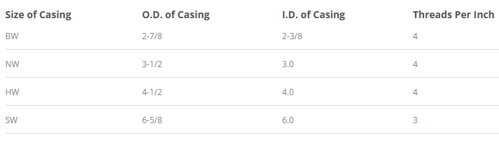 “W” series casing offers the extra strength of double butt joints and added ease in cleaning threads. Our casing is flush threaded inside and out and, because of its’ “W” series design, it does not require the use of a coupling. The outside diameter of each size casing will fit the hole drilled by the next larger size core bit. The dimensional design also allows one size of casing to fit within the next larger size.