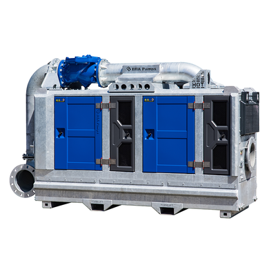 The BA300E is a 12-inch BBA Pumps centrifugal pump with open impeller and adjustable wear plate with cutting slots. The large solids handling is unparalleled at 105 x 120 mm, making this a real dirty water pump. Best-in-class pump efficiency and an excellent NPSH curve lead to an ultra-performing unit. Other standard features are large inspection covers, suction and pressure gauges and a heavy duty bearing frame with an extra oil chamber for dry running.