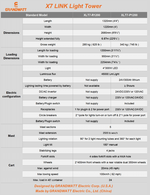 GRANDWATT X7 LINK Light Tower, a mobile light tower which can be powered by an external power source like a power generator, the main or another light tower with built-in generator, it also can be powered by its built-in lithium battery, battery is optional. The main feature of the X7 Link light tower, up to 3 Link towers can be connected in series to a single power source, providing an high illumination area with reduced fuel consumption. For the model with lithium battery, it can light above 5 hours with zero CO2 emissions and zero noise, zero fuel consumption, zero maintenance.