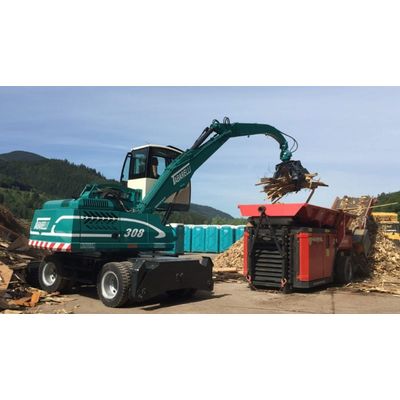 The T308 material handler adds versatility and dependability to any scrap, waste, or fiber operation. This 17-ton material handler is available in either electric or diesel and features a two-piece boom with a 27-foot reach with grapple on rotator. The T308 also features a front heavy-duty blade, two rear stabilizers, and puncture proof solid rubber tires.
