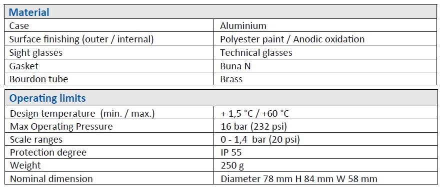 XAM-100-Evo differential gauge measures the differential pressure between the inlet and the outlet for the AIR VIP and AIR VIP Evo series. With the scale centrally set at “ 0 “ the gauge can be mounted with a rotation of 180°. The gauge can be mounted without taking into account the flow direction. Suitable for outdoor installation, see the below limits.