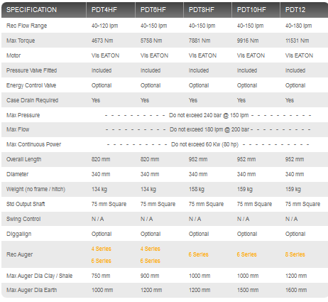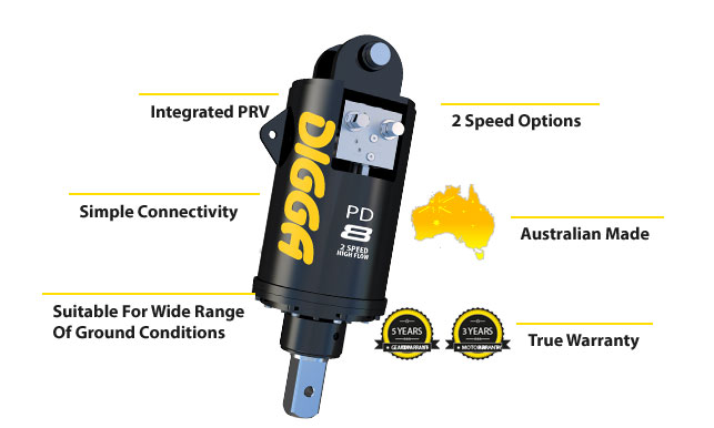 Digga`s 2 speed drilling auger drives for High flow machines have been designed for a wider range of applications. Offering a high speed, low torque setting for the smaller auger jobs when you need that extra RPM, and low speed, high torque for when you really need to grind out that larger diameter hole. It`s like having 2 drive units in 1.