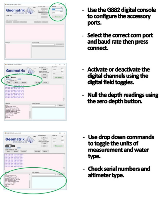 To eliminate the requirement for scale and bias values Geomatrix (endorsed Geometrics inc) developed the Digital Accessory Board which passes the digital altimeter value and digitises the depth, pitch and roll measurement, eliminating the need to enter scale and bias values and the quality checks that go with it.