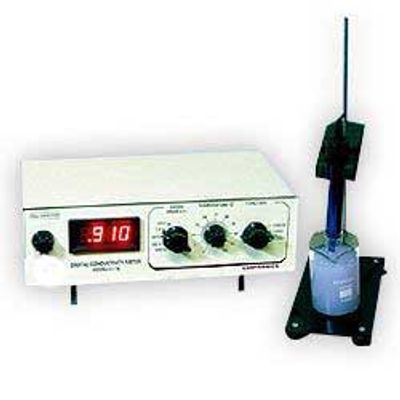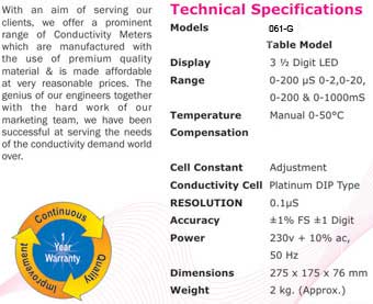 Digital Conductivity Meter with manual temperature compensation facility is a highly stable, rugged, reliable, and accurate test instrument for measurement of conductivity of aqueous solutions. In short, this Digital Conductivity Meter has Auto Temperature Compensation 0 to 100oC, Range 0 uS/cm to 1000mS/cm, selection in 5 steps, Accuracy +0.5% FSD +1 digit, Cell Constant Compensation 0.5 to 1.5 adjustable, 3½ digit LED display. It is extremely useful instrument for agricultural and soil analysis labs, swimming pools, fertilizer plants, petroleum refineries, textile plants, aquatic flower & fish farming, etc.