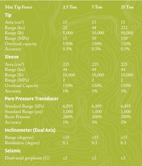 The cone is available with our standard channels (tip, local friction, pore pressure, inclinometer, seismic, and temperature) and can be used in conjunction with our Vision or Resistivity modules.