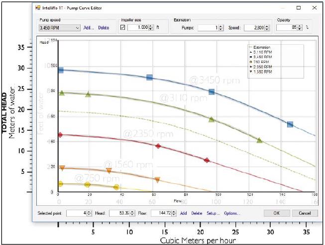 The Pump Curve Editor allows the user to copy, through its transparent interface, the variable speed pumps curves supplied by a manufacturer. The Configurator generates formulas for these curves so the Volucalc computes the right flow rate whatever the pump’s speed at any head.