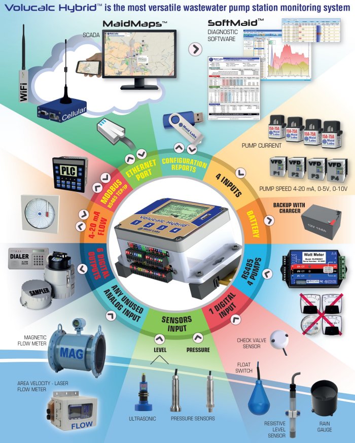 The best sewer / wastewater pump station monitoring solution for up to 4 pumps. The best sewer / wastewater pump station monitoring solution for up to 4 pumps. Volucalc RT is a variable and constant speed pump flowmeter. For variable speed pumps, it uses the pump curves flow/head/RPM of 1 to 4 pumps, the level and pressure signal and generates a flow proportionnal 4-20mA output. It uses the most advanced patented volumetric flow algorithm for constant speed pumps. Data is downloaded to a USB key or MaidMaps. No software required to produce reports. MaidMaps can activate a remote relay and display readings.
